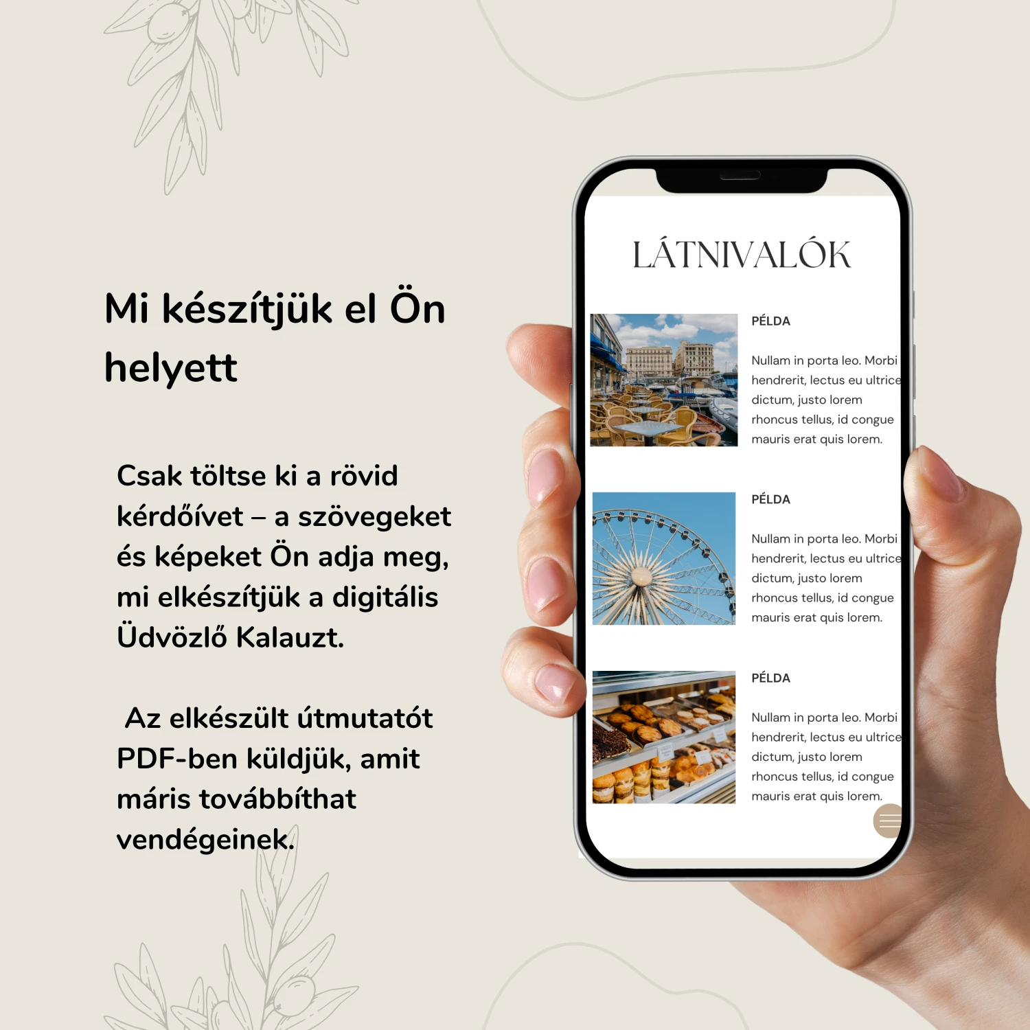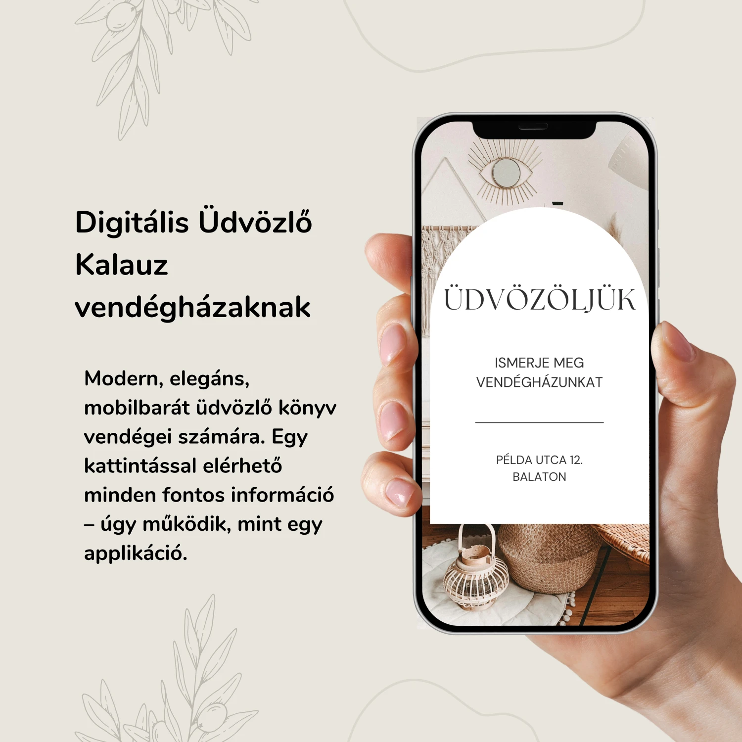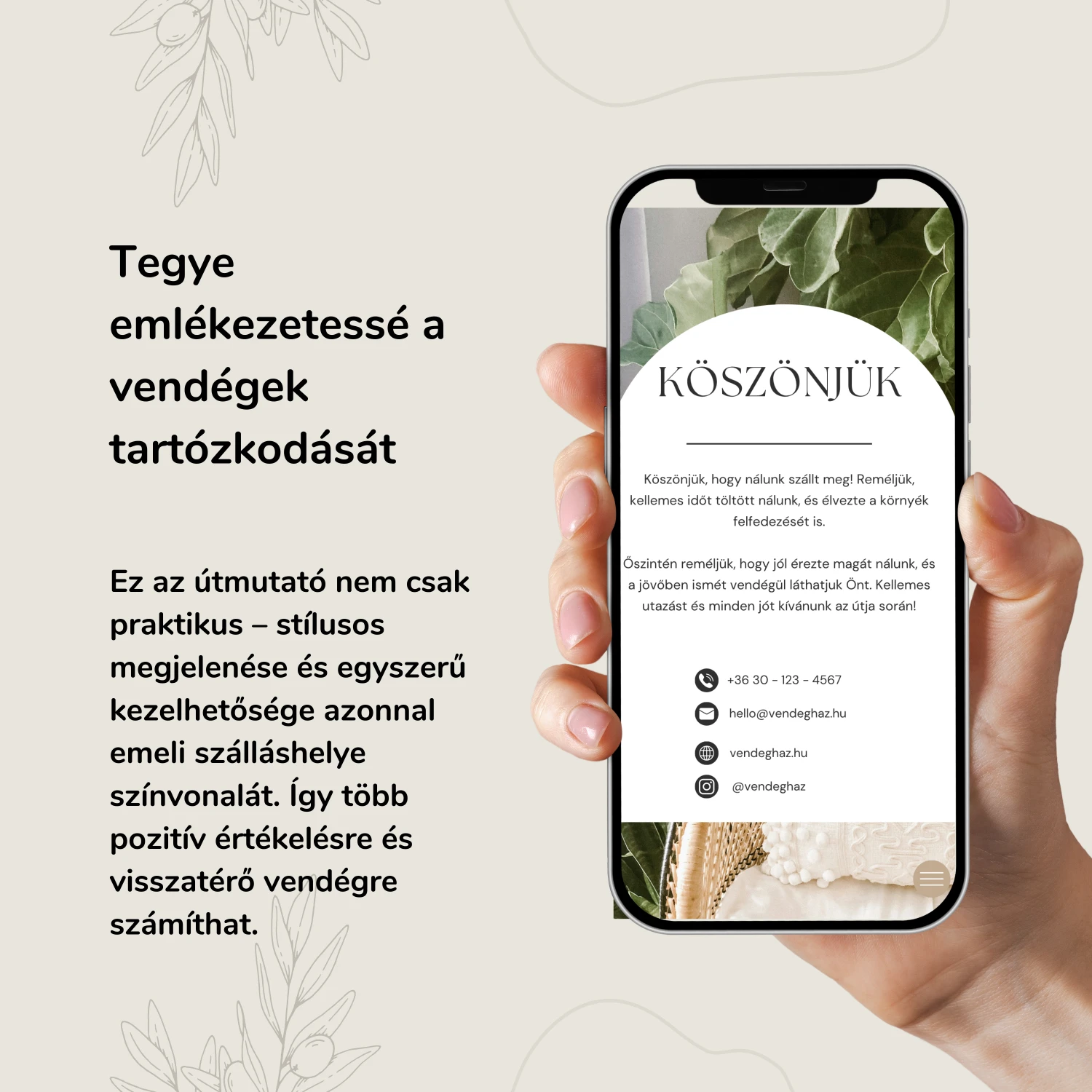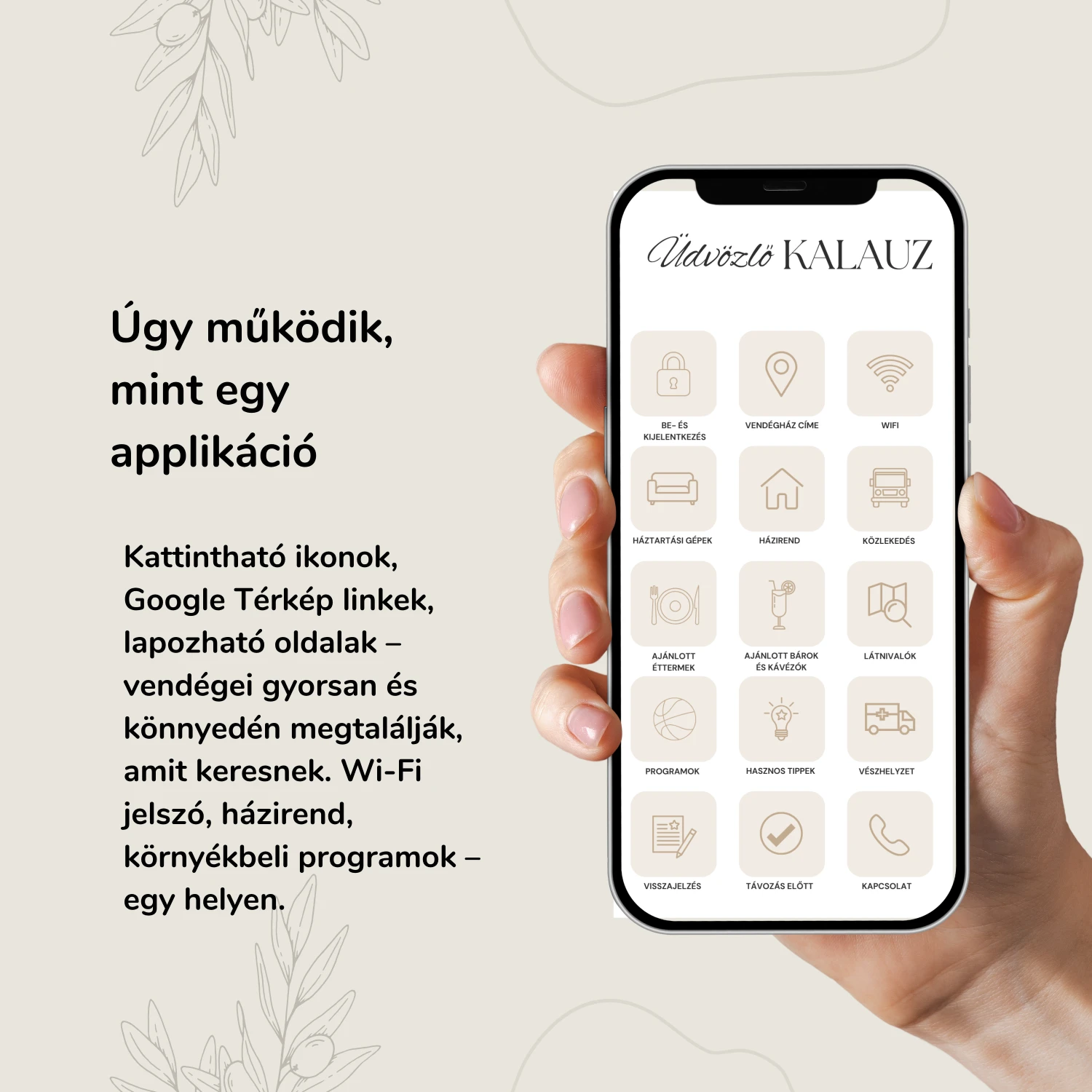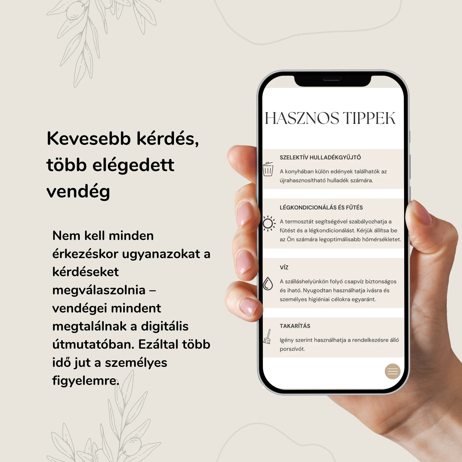 A digitális üdvözlő kalauz lényegében online, mobilra optimalizált vendégvezető, amely úgy működik, mint egy applikáció – de nem kell telepíteni. Ebben található minden fontos tájékoztatás vendégei számára: házirend, Wi‑Fi jelszó, környékbeli ajánlók, térképek és linkek – egyetlen kattintással elérhetők.