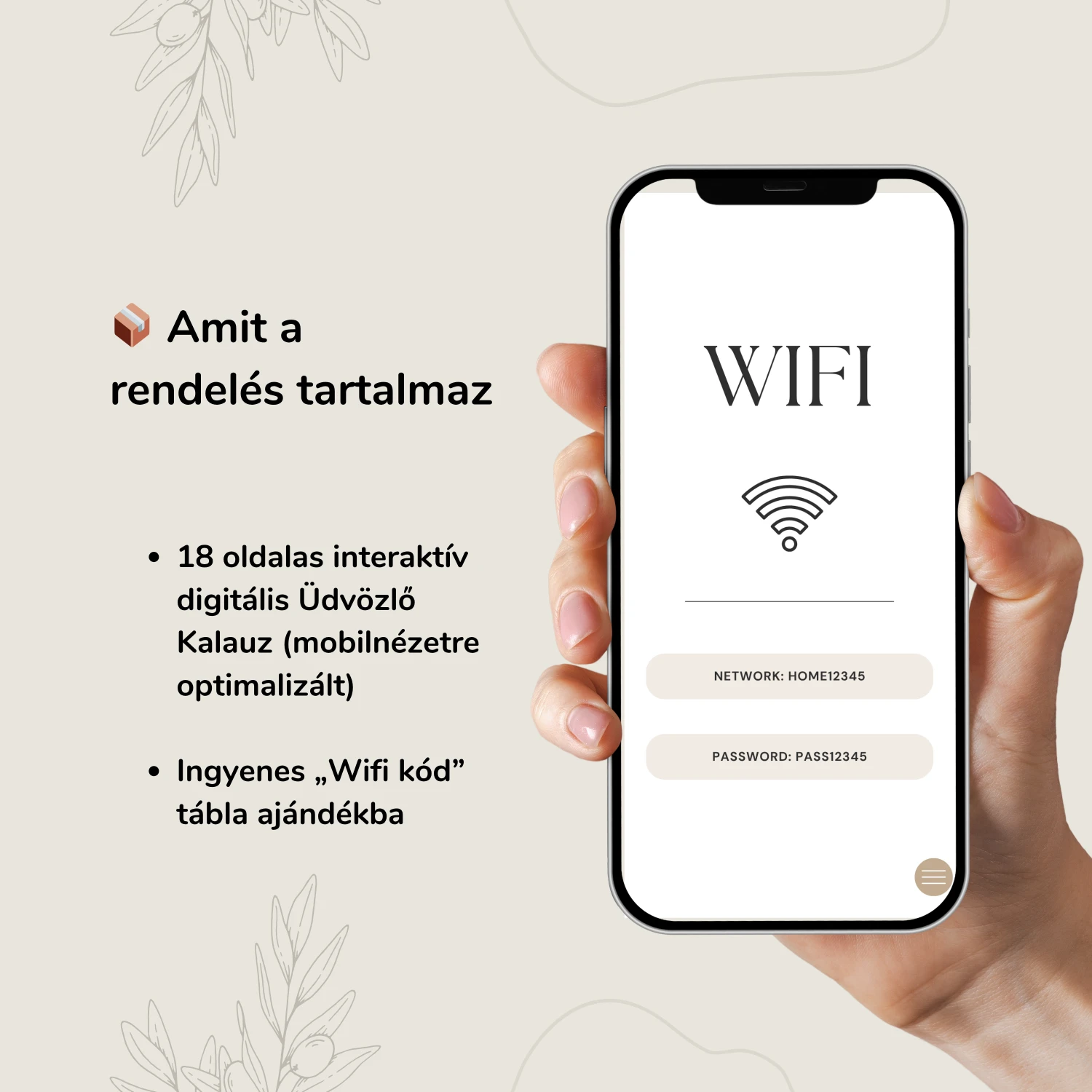 Mobilra optimalizált, interaktív 18 oldalas Üdvözlő Kalauzt és az AJÁNDÉK Wifi kód táblát.